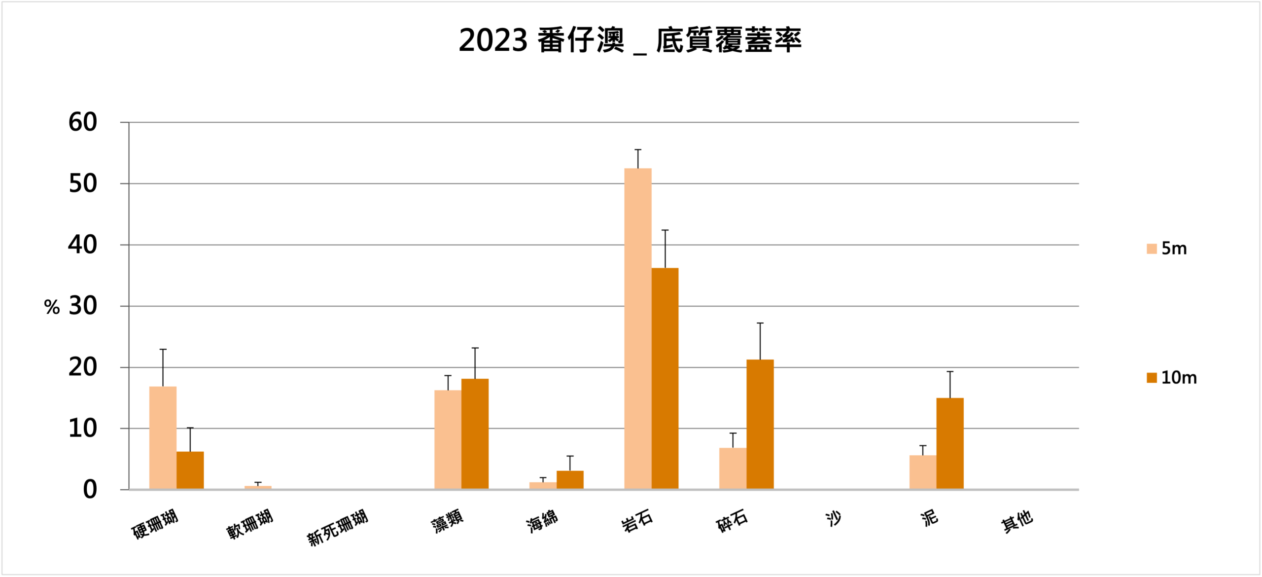非生物底質類型中,以岩石最高,5米處覆蓋率為52.5%,在10米處為36.25%。次高為碎石,在5米處覆蓋率為6.875%,10米處為21.25%。5米、10米處皆有記錄到泥沙,覆蓋率分別為5.625%、15%。雖然泥沙多覆蓋在岩石表面,但也觀察到部份覆蓋於硬珊瑚上。泥沙因粒徑細小,受擾動後容易揚起,導致水層混濁,減低透光,此外,若過多泥沙覆蓋於珊瑚上,也可能導致珊瑚窒息死亡。因此,泥沙覆蓋率的變化也值得關注。