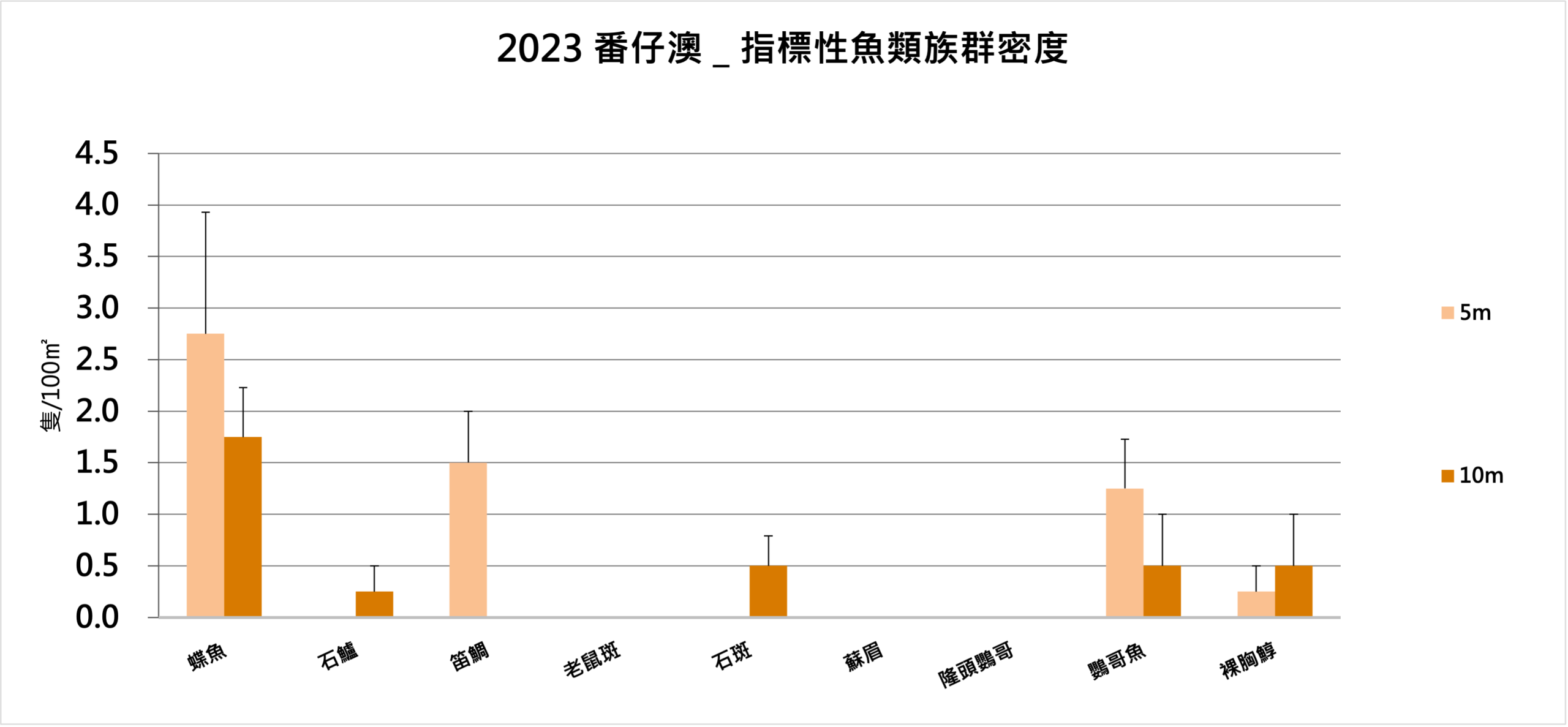 指標性魚類部份,5m及10m處皆有觀察到蝶魚、鸚哥魚及裸胸鯙。族群密度最高者為蝶魚,5m、10m處分別為2.75隻/100m²及1.75隻/100m²。鸚哥魚在5m、10m處族群密度分別為1.25隻/100m²、0.5隻/100m²,裸胸鯙的數量則分別是每100平方公尺0.25隻、0.5隻。此外,5m處記錄到笛鯛,族群密度為1.5隻/100m²;10m處則觀察到石鱸與石斑魚,分別為0.25隻/100m²及0.5隻/100m²。本次調查,超過半數的種類皆有記錄到。