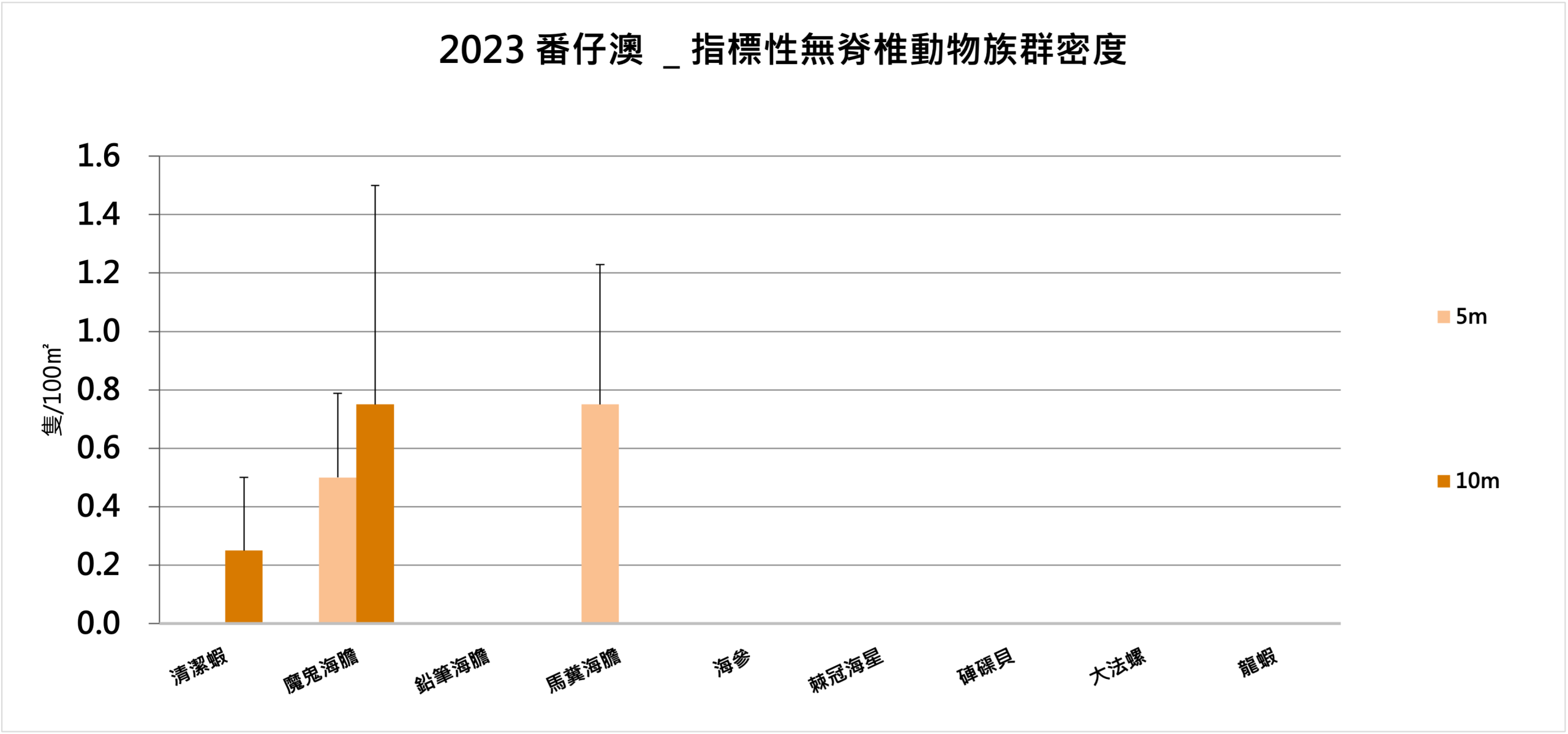 指標性無脊椎動物部份,則記錄到清潔蝦、魔鬼海膽及馬糞海膽。魔鬼海膽的族群密度,5m處為0.5隻/100m²,10m處則為0.75隻/100m²。清潔蝦僅在10m處記錄到,為0.25隻/100m²;馬糞海膽則在5m處記錄到,為0.75隻/100m²。與歷年調查結果一致,每年皆能記錄到少量魔鬼海膽,而清潔蝦及馬糞海則是偶有紀錄。