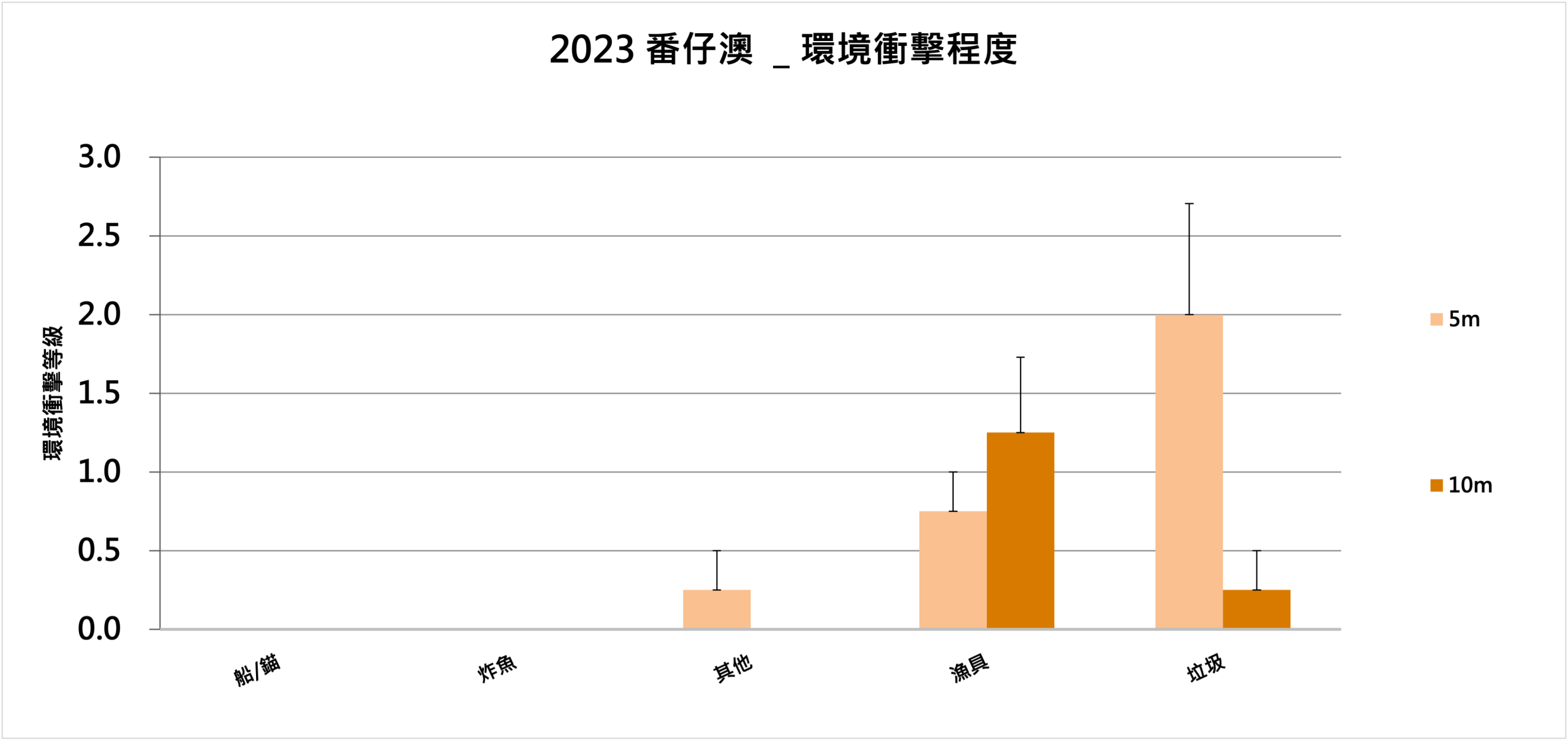 依據國際珊瑚礁體檢指引手冊,調查員需記錄每個子樣區中珊瑚損害、垃圾堆積等環境衝擊事件的件數。環境衝擊程度的定義為:0 = 無,1 = 低度環境衝擊(1件),2 = 中度(2到4件),3 = 高度(5件以上) 。圖表顯示了各樣區的平均環境衝擊程度。